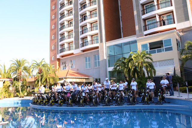 O visual é realmente incrível e chama bastante atenção, já que todas as bikes ficam dentro da piscina com vista para toda área verde do hotel, pessoal lindo e muita animação contou com a presença marcante do ator Raul Gazolla que está com peça teatral no Teatro Amil “Pressão Alta – Crônicas de Um Ator” que estará em cartaz até dia 02/06.
